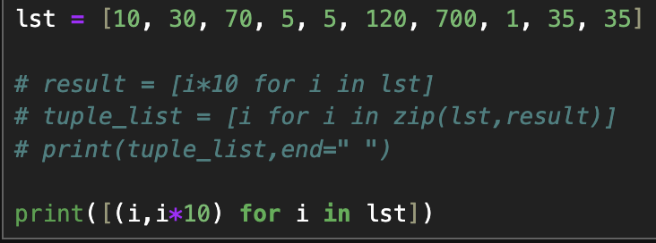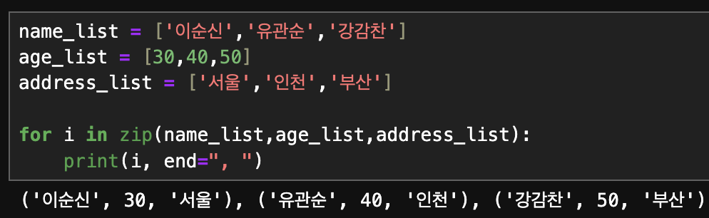 위의 zip() 예제와 비슷한 문제 형식으로 접근했었다. list에 담겨 있는 원소들을 다른 리스트에 저장해서 zip()으로 합치는 것이 아닌, 변수 자체를 Tuple 식으로 묶어서 리스트로 변환해 준다면 같은 결과를 나타내는 점을 배웠다.