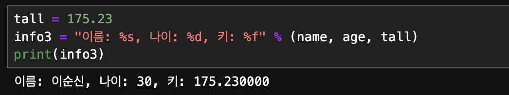 f-string을 주로 써왔던 것 같다. 그냥 다른 방법으로 출력할 생각을 주로 했는데, C언어에서 사용하던 방식이 Python에서도 같은 방식으로 출력할 수 있다는 점을 깨달았다.