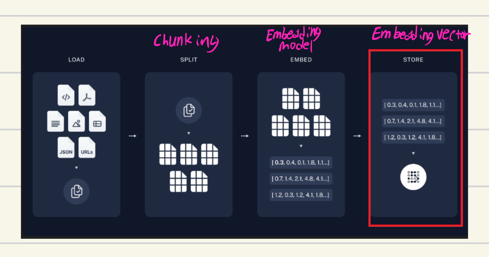 RAG에서 중요한 개념 중 하나가 vector DB이다. vector DB는 앞에서 설명한 Embedding vector를 생성하여 저장하는 곳이라고 생각하면 된다. 여기서 핵심은 이를 통한 유사도 평가이다. 최종 vector 값을 DB에 저장하여 유사도를 파악하는 것이 핵심이다.