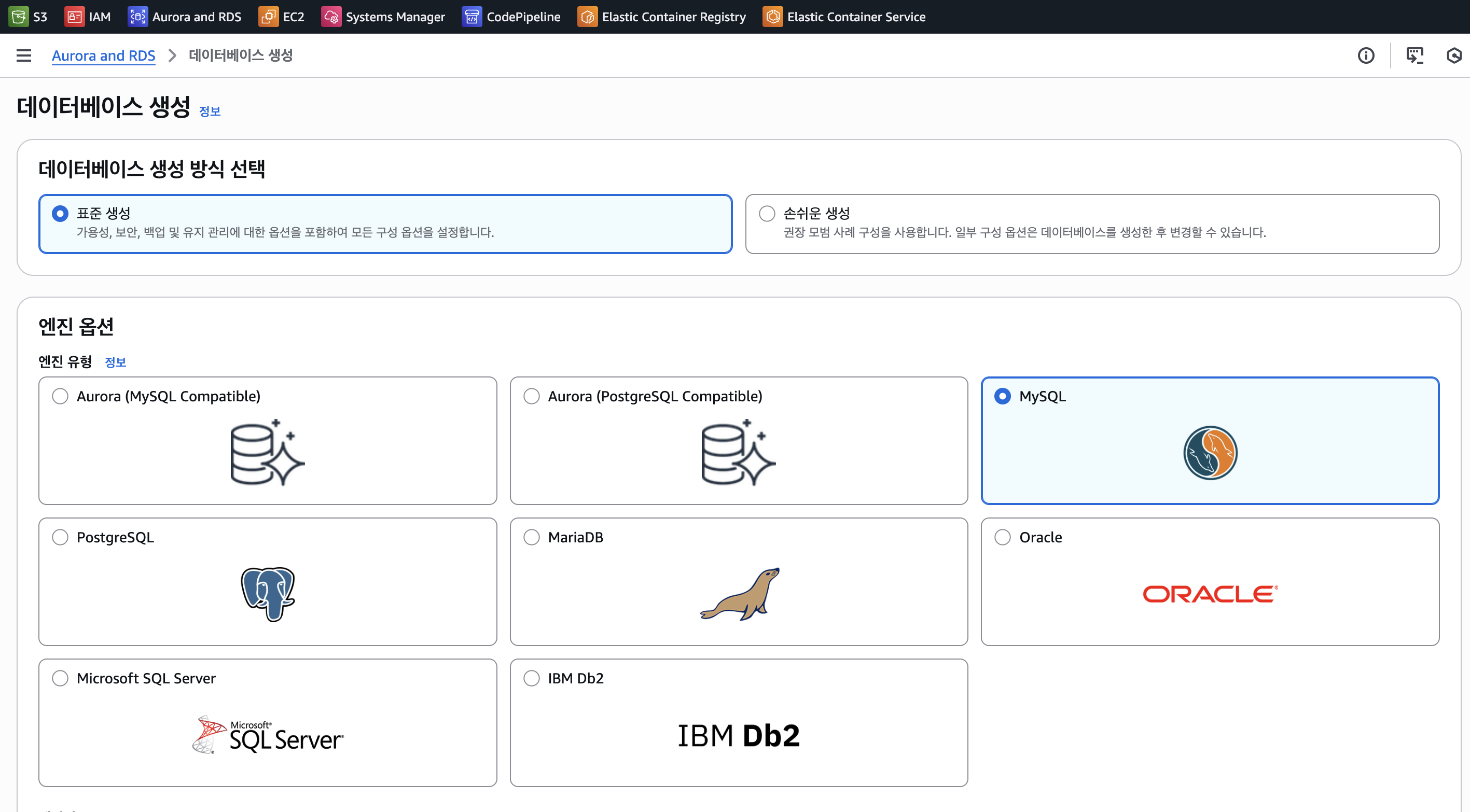 AWS 내 Aurora and RDS로 생성 가능하다. 템플릿을 프리티어로 쓸 경우 내부에서만 DB 접근이 가능하다. 실제 운영은 프로덕션으로 하면 되고, 여기서는 개발/테스트로 진행했다.
