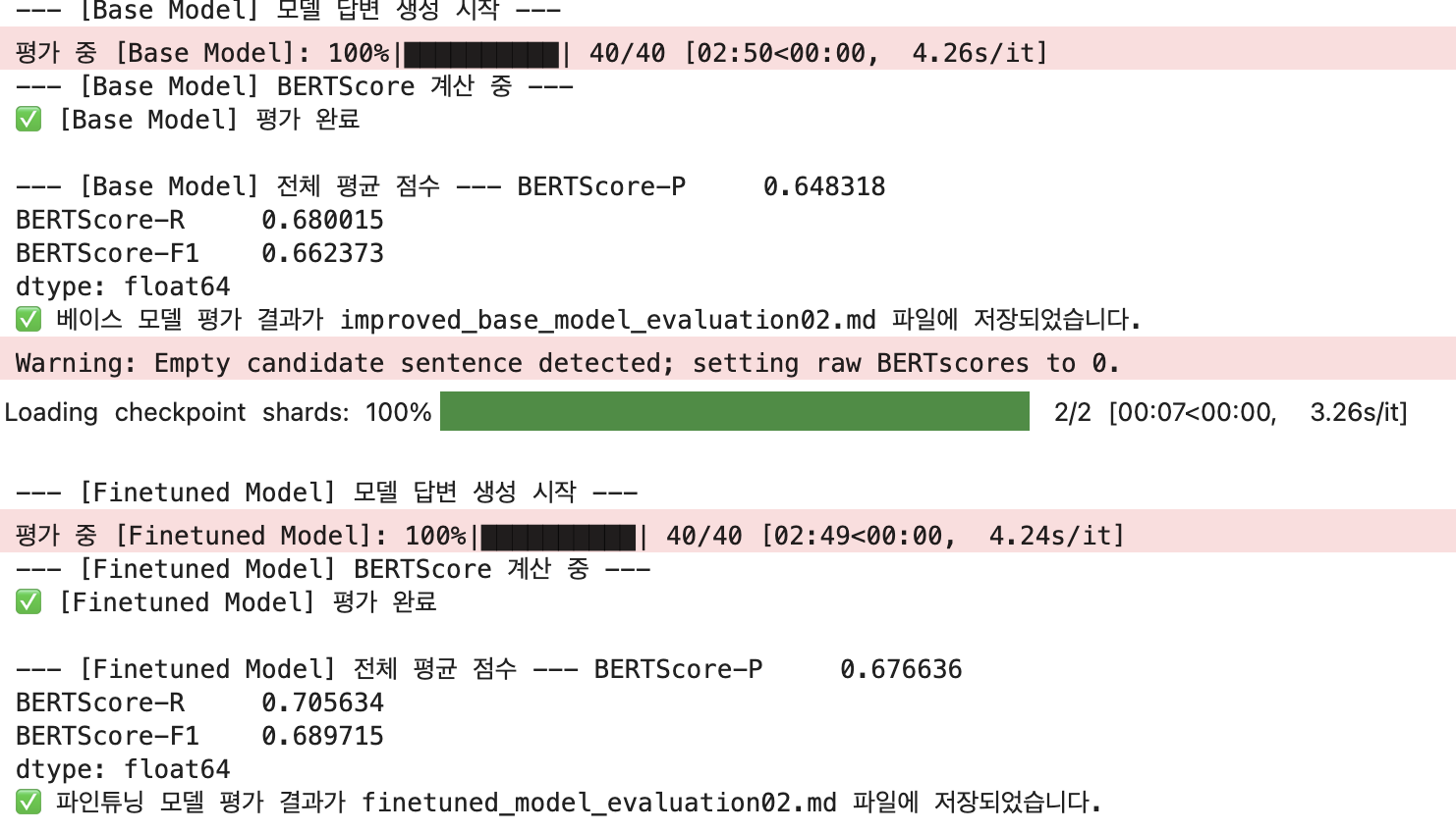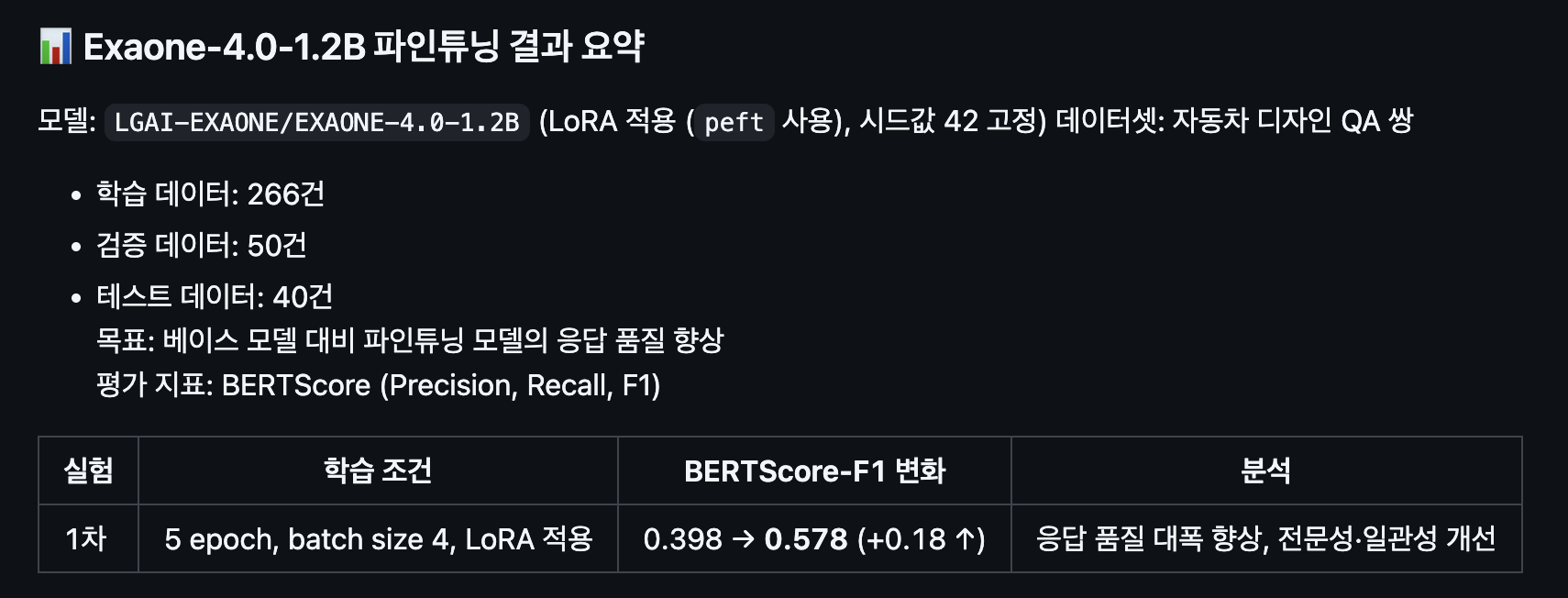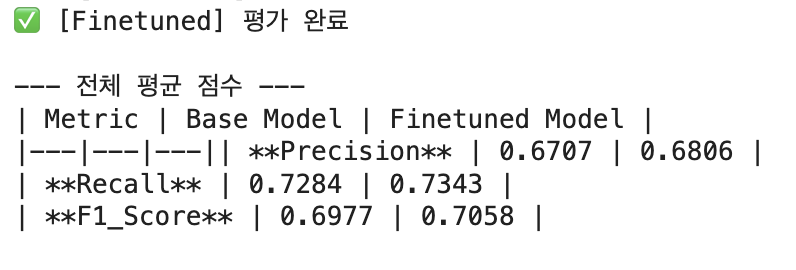 위 3가지 방법을 다 적용시켜서 파인튜닝한 결과 BertScore 중 F1 Score가 0.18밖에 오르지 않았다. 이는 성능이 향상은 됐지만, 큰 폭은 아니라는 점이다. 그러나 성능이 올라 기분은 좋았다.