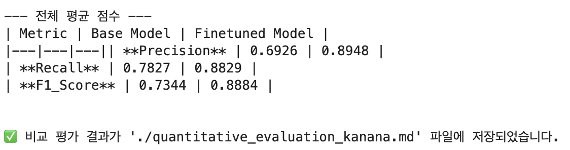 kanana를 선택한 이유는 저번 Baseline 모델 성능 평가 결과 2안이었기 때문이다. 확실히 exaone은 1.2B 아니면 32B였기 때문에, 1.2B를 선택한 결과를 이렇게 본 것 같다. 그래도 kanana는 8B 모델이라 성능도 잘 나오고 좋았다.