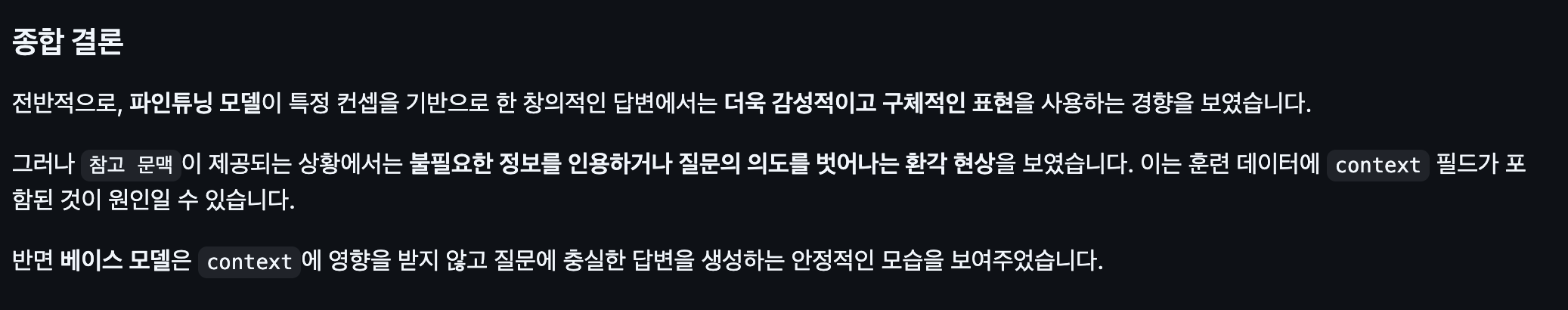 정성평가 결과는 나쁘지 않았다. 기본 모델도 충분히 잘 대답해서 놀랐다. 그렇지만 아쉬운 점이 있었다. 그 점은 아래 그림을 통해 설명하겠다.