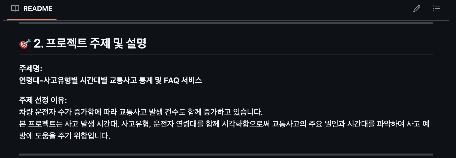 우리 팀 주제는 사고 차량 관련하여 연령대, 시간대별 사고 유형 및 건수를 시각화 하는 것이었다. 처음 하는 사람들이 많았다 보니, 많은 분들이 첫 구성부터 어려움을 느꼈다. 대신, 하다 보면 완성되는 기능들이 눈에 보이다 보니, 뜻깊은 프로젝트가 될 수 있겠다 싶었다. 실습 시간에 사용해 보았던 함수들 뿐만 아니라 원하는 정보를 긁어오는 과정 자체가 눈에 보여 괜히 뿌듯했었다. 또 기능을 원하는 방향으로 직접 바꿔가면서 프로젝트를 진행한 부분이 좋았던 점이었다.