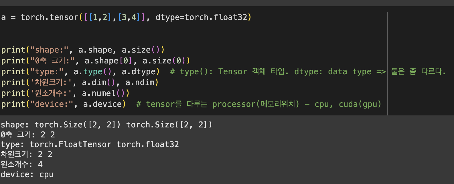 여기서는 Tensor 자체가 파이토치에서 데이터를 저장하는 자료구조로 생각한다. 물론 숫자 데이터 타입만 지원한다. 숫자 데이터 타입을 지원하다 보니, float이나 int 등과 같은 타입 지정도 가능하다. 대부분 numpy와 같이 dtype이나 item과 같은 method를 쓰기 때문에, 큰 이질감은 없었지만, 축의 위치나 차원 수가 중요하다는 부분이 크게 와닿았다.