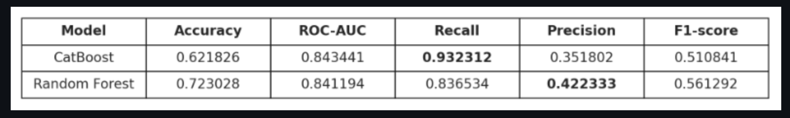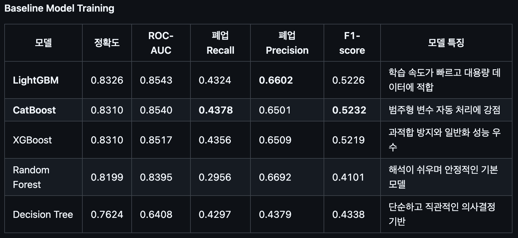 CatBoost와 Random Forest를 채택했다. Catboost는 성능이 가장 좋았고, Random Forest는 비교를 위해 Feature importance 생성 용으로 사용하였다.