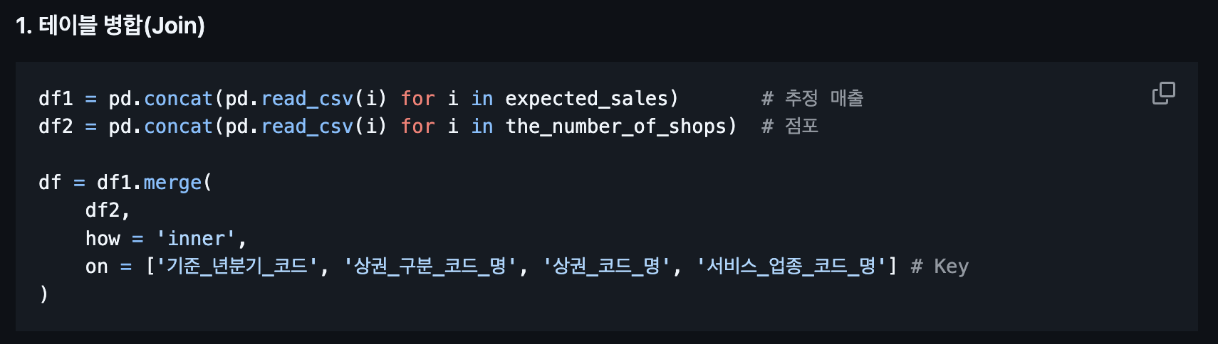 우리 조의 사전 데이터는 크게 매출액 데이터와 폐업 및 개업 수 데이터 2개이다. 이를 위해 merge를 진행해야 한다.